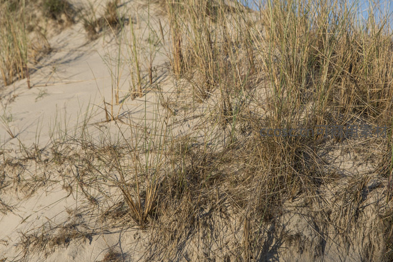 细密的沙生草丛扎根于松软沙土中,叶片在微风中轻轻摇曳,为单调的沙海增添一抹顽强的绿意与动感。