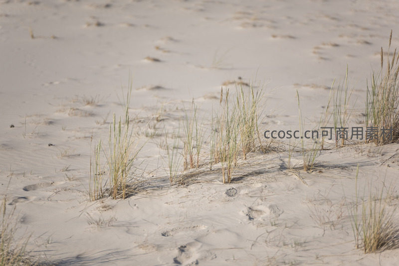 几簇纤细的草芽从细腻的白沙中探出头来,在柔和光线下投下淡淡阴影,展现着荒漠中细微却不可忽视的生命力。