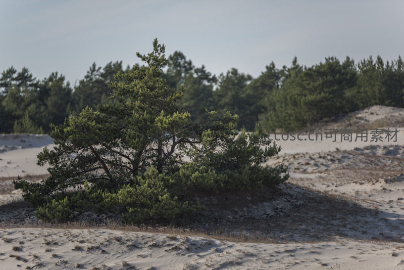 一棵苍劲的松树扎根于广袤沙丘之上,背景是连绵的森林与晴朗天空,展现出生命在恶劣环境中的顽强与美丽。