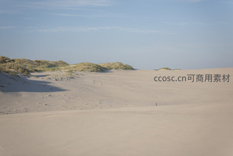 沙丘边缘与绿色草甸相接,柔和的光线投下明暗对比,凸显沙丘起伏的线条美,呈现大自然的静谧与和谐。
