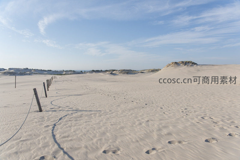 阳光洒在广阔的沙滩上,蜿蜒的足迹通向远方,木桩与绳索构成的简易围栏引导视线,远处沙丘与蓝天相接,营造出一片宁静而开阔的海滨景象。