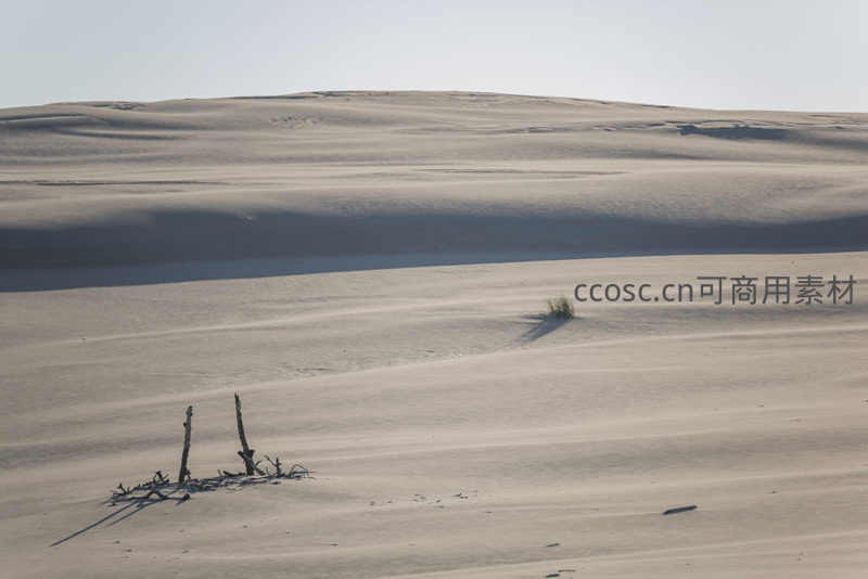 在无垠的沙丘之上,一株顽强的小草和几根枯枝成为视觉焦点,柔和的光影勾勒出沙丘的起伏轮廓,展现出大自然的苍凉之美与生命的坚韧。
