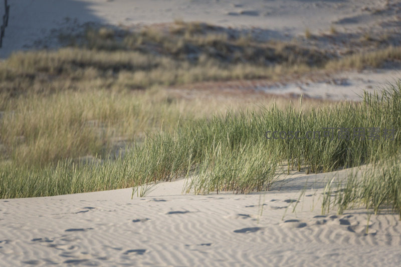 细腻的沙粒与翠绿的海草在沙丘边缘交相辉映,微风吹拂下草叶轻舞,沙面上留下细密的波纹与零星足迹,呈现出自然生态的细腻与静美。