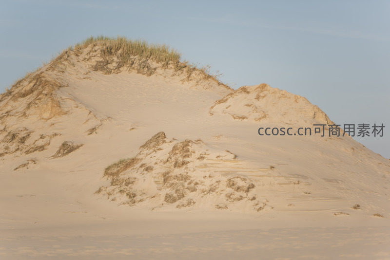 夕阳余晖为巨大沙丘披上金色外衣,顶部茂密绿草如天然王冠,沙坡线条流畅,展现自然力量塑造的地貌之美与生命的顽强。