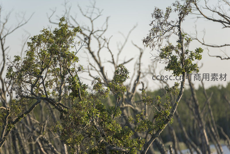 在柔和的光线下,新生的绿叶与背景中枯槁的树枝形成鲜明对比,展现了生命在荒芜中顽强复苏的景象,充满诗意与哲思。