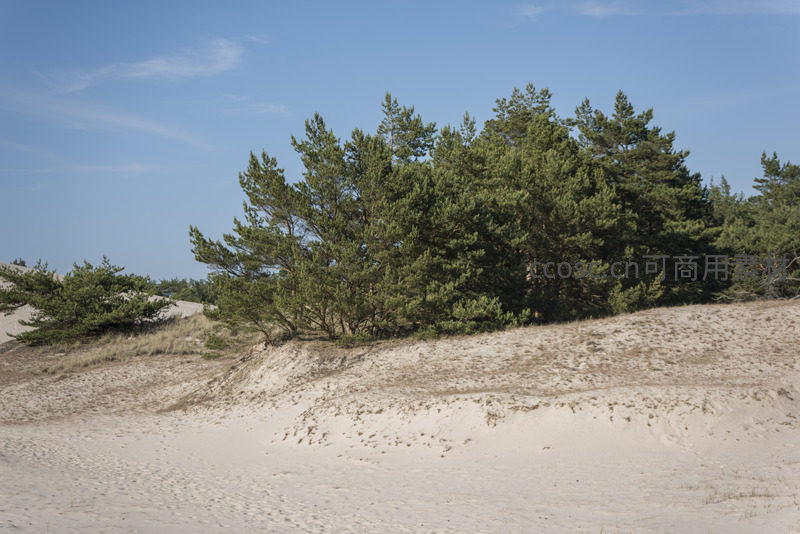 在蔚蓝天空下,茂密的松树林扎根于高耸的沙丘之巅,为这片金色的沙海带来一抹生机,是自然力量与柔美并存的见证。
