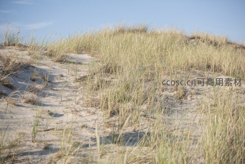 金黄色的草穗在微风中轻轻摆动,覆盖着连绵的沙丘,阳光透过草叶,形成温暖柔和的画面。