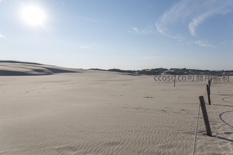 无垠的沙滩在阳光下泛着柔和光泽,细密的沙纹如波浪般延展,远处木栅栏静静伫立,勾勒出海岸线的边界。