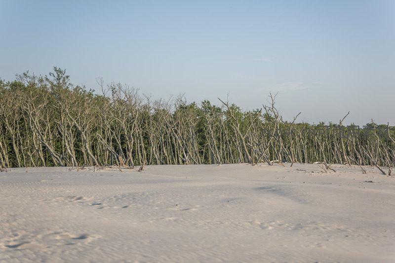 洁白细腻的沙滩延伸至远方,背景是形态各异的枯树林,形成强烈的视觉对比,营造出一种荒凉而诗意的自然氛围。