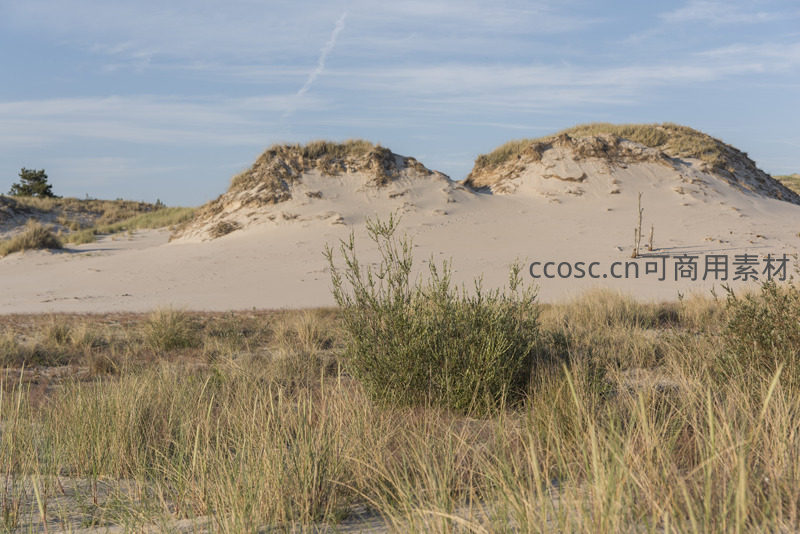 连绵沙丘顶部覆盖稀疏植被,远处蓝天飘着云丝,构成一幅原始而和谐的自然生态画卷。