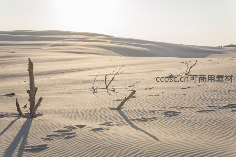 夕阳斜照下,散落枯枝与清晰脚印嵌入沙面,长影拉伸,营造出孤寂又诗意的沙漠氛围。