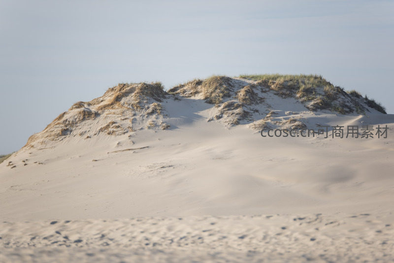 起伏的沙丘顶部点缀着顽强生长的绿草,在清澈天空的映衬下,展现出大自然的柔和与壮美。