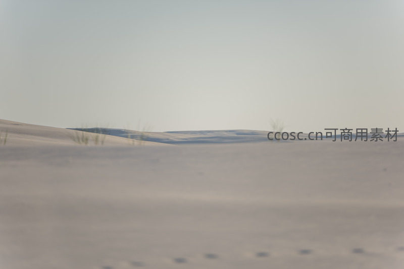 画面以柔焦处理呈现远方沙丘的朦胧轮廓,几株稀疏小草若隐若现,营造出空灵、寂寥而富有诗意的氛围。
