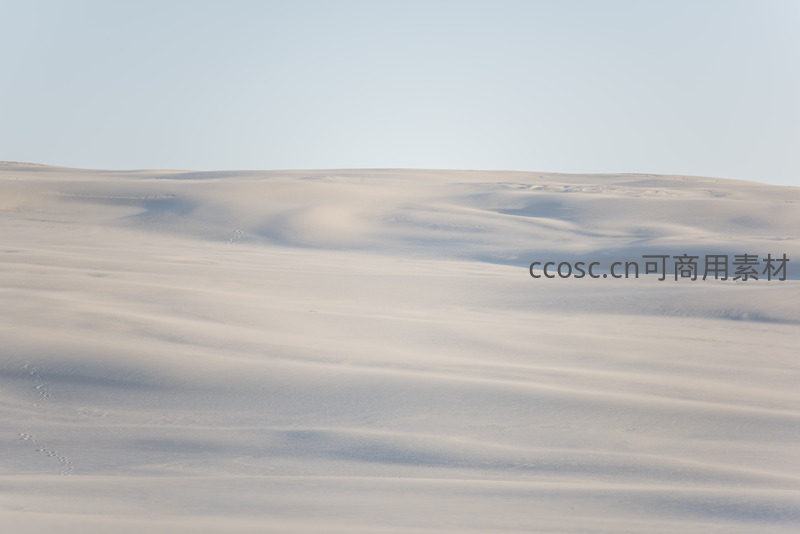 无垠的沙丘在晴朗天空下铺展,柔和的光影勾勒出流畅的曲线,展现大自然鬼斧神工的静谧之美。
