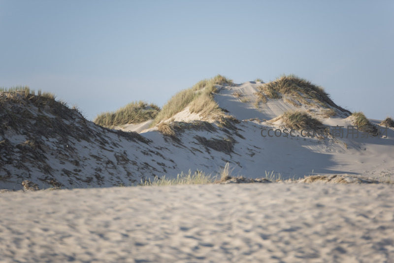 连绵起伏的沙丘被风吹拂成优美的波浪形态,顶部覆盖着稀疏的草丛,前景是细腻的沙粒,整个画面宁静而壮阔,尽显大自然鬼斧神工。