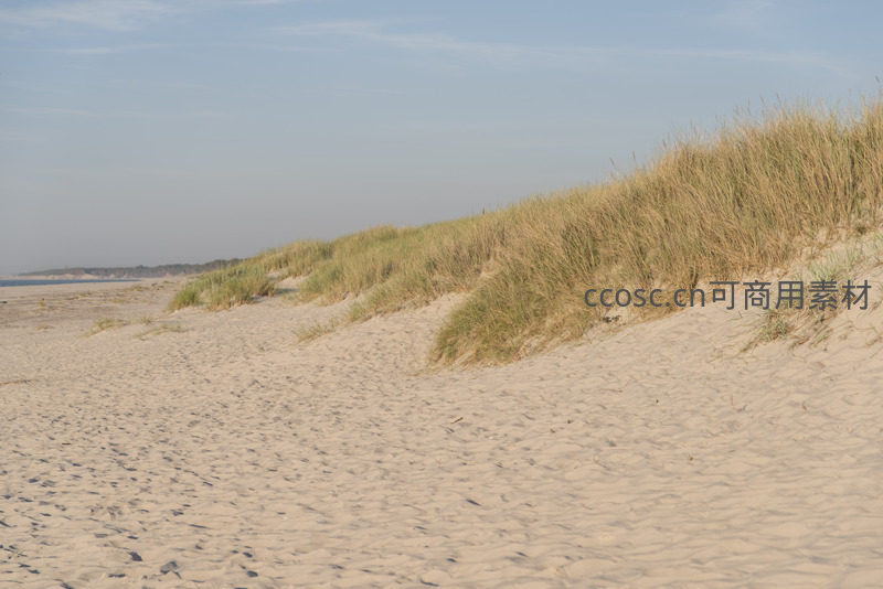 绵延的沙丘覆盖着金黄草丛,向远处的海岸线延伸,蓝天白云映衬下,营造出辽阔、宁静且充满度假气息的景象。