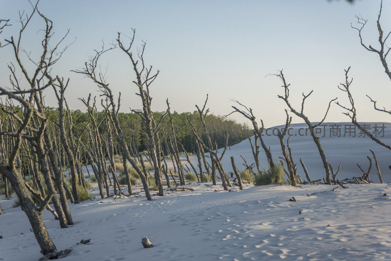 在广袤的白色沙丘上,枯死的树木如沉默的守望者,背景是郁郁葱葱的森林,形成强烈对比,展现自然的沧桑与宁静。
