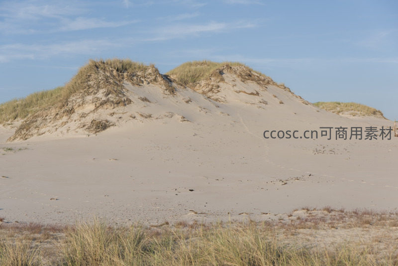 起伏的沙丘覆盖着坚韧的草甸,在晴朗的蓝天下显得格外柔和宁静,是大自然鬼斧神工雕琢出的诗意地貌。