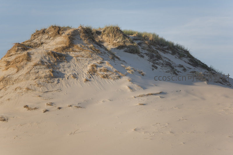 被干草覆盖的沙丘顶部在阳光下泛着暖色光泽,细腻的沙纹与草茎交织,呈现大地柔美而坚韧的肌理。
