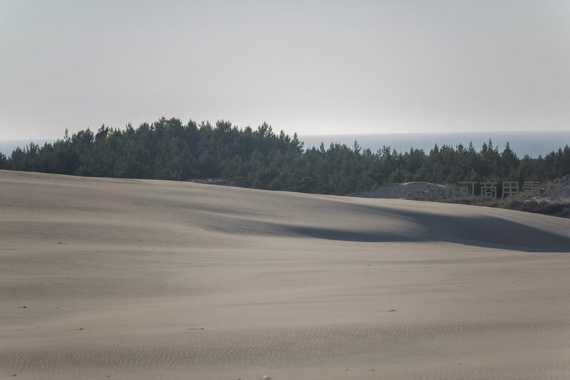 柔和的阳光洒在连绵起伏的沙丘上,远处深绿的松林如一道天然屏障,构成一幅静谧而壮丽的海岸生态画卷。