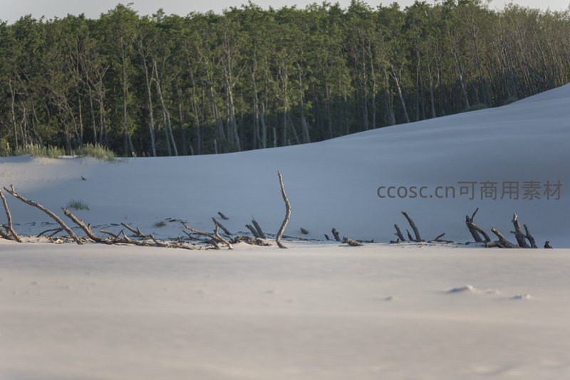 雪白的沙丘上散落着扭曲的枯枝,背景是浓密的墨绿色树林,强烈的色彩与质感对比营造出一种静谧而略带萧瑟的自然意境。