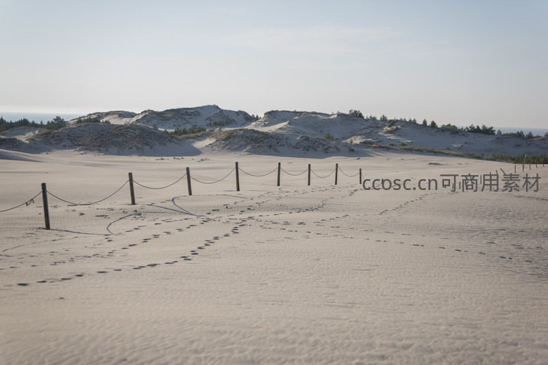 细腻的沙丘上留下一串串脚印,延伸向远方,木桩与绳索围栏蜿蜒其间,背景是起伏的沙丘与稀疏植被,天空清澈宁静。