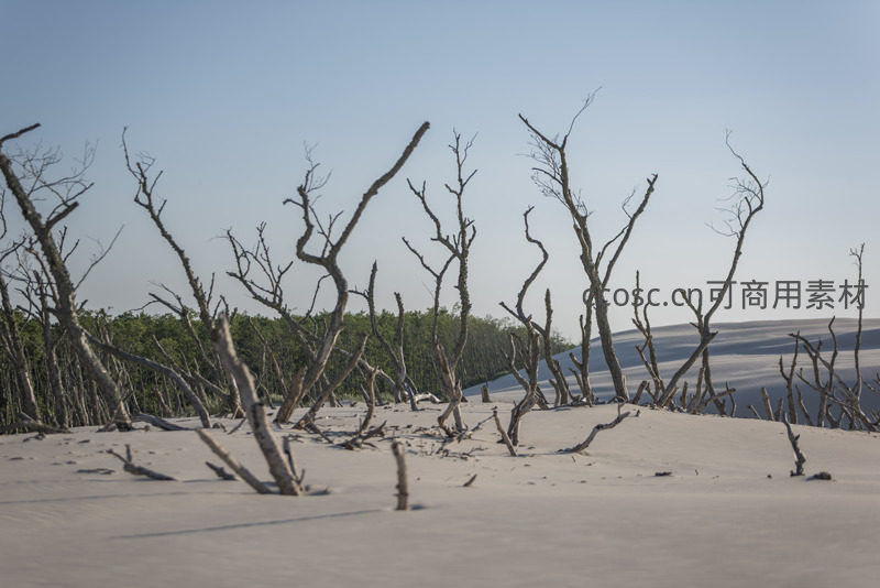 光秃的枯树枝干扭曲地刺向天空,与洁白无瑕的沙丘形成强烈视觉对比,远处绿林若隐若现,营造出一种静谧而苍凉的氛围。