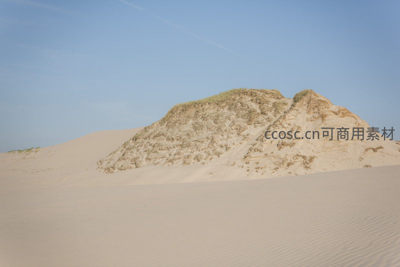 一座被绿色草甸部分覆盖的沙丘静静矗立,沙粒纹理清晰可见,蓝天如洗,云迹轻掠,展现出自然生态的和谐与壮美。