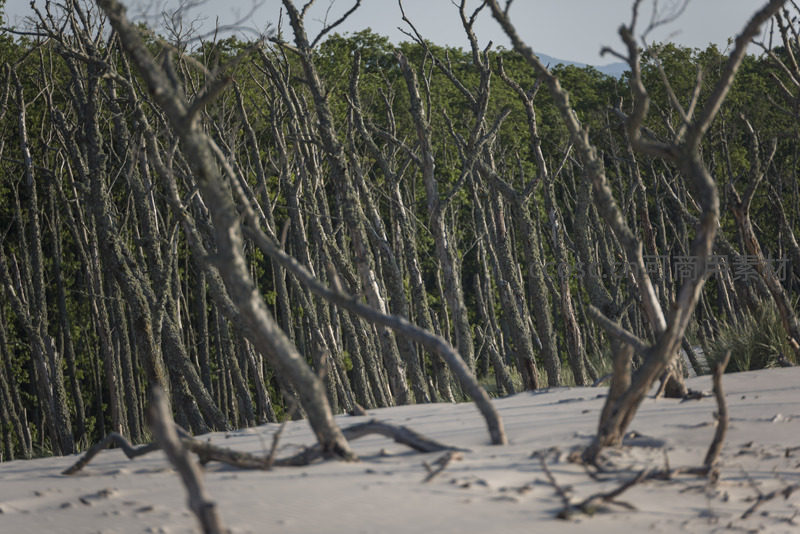干枯的树枝斜插在洁白的沙地上,背景是茂密的绿林,光影交错间营造出一种荒凉又诗意的独特美感。