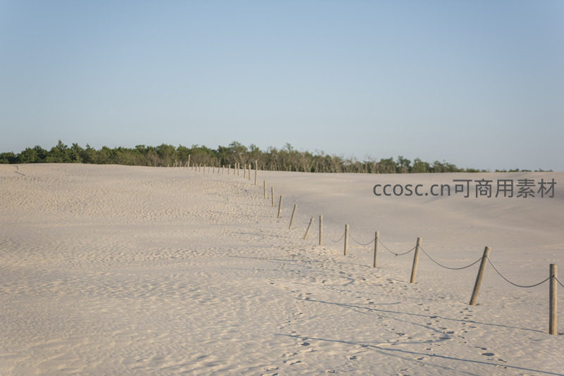 一条由木桩和绳索引导的小径蜿蜒穿过无垠白沙,远处是郁郁葱葱的树林,脚印点缀其间,引人探索这片静谧的海滨秘境。