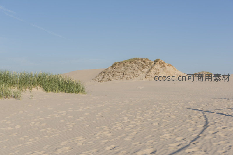 阳光洒在起伏的沙丘上,绿草在风中摇曳,沙地上留有零星脚印,远处的小山丘被薄雾笼罩,展现出海边沙丘的静谧与生机。