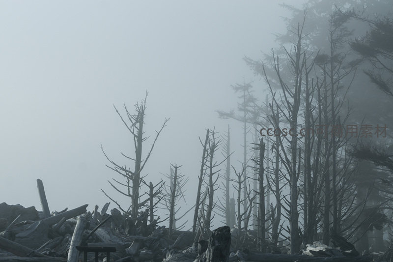 厚重的雾气中,扭曲的枯树枝干如同鬼魅般伸向天空,前景堆积的朽木强化了场景的荒芜感,仿佛时间在此凝固。