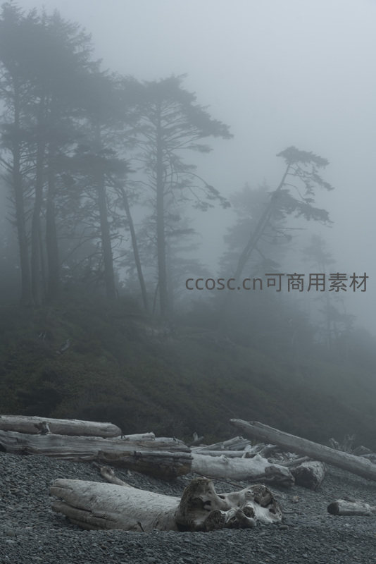 轻柔的雾气缭绕在长满青苔的山坡上,高大的松树挺拔而立,巨大的漂流木横陈于前,构成一幅和谐而幽深的海滨画卷。