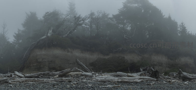 浓雾笼罩着海岸悬崖,散落的枯木静卧在砾石滩上,背景是若隐若现的苍翠树林,营造出一种神秘而孤寂的自然氛围。
