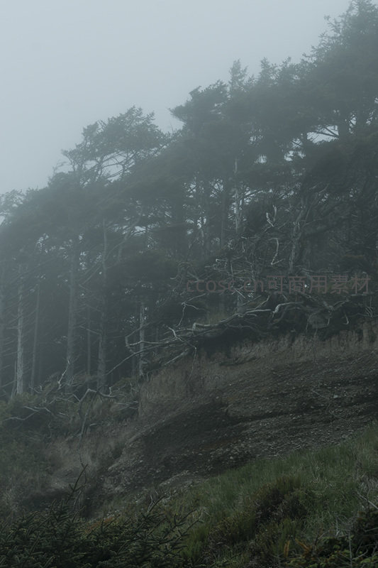 在弥漫的雾霭中,森林覆盖的悬崖显露出其嶙峋的肌理,倒伏的枯木与挺拔的松树形成对比,展现出大自然原始而震撼的力量。