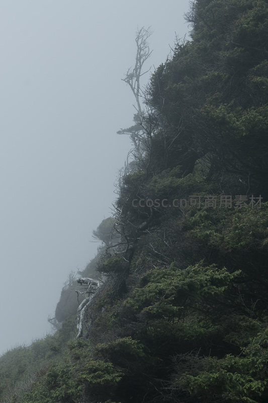 雾中峭壁孤树,苍劲挺立显自然之力