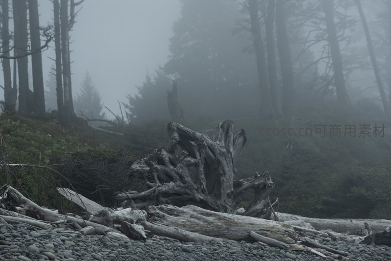 浓雾笼罩着海岸线,巨大的漂流木散落在鹅卵石滩上,背景是若隐若现的针叶林,营造出一种神秘而孤寂的氛围。