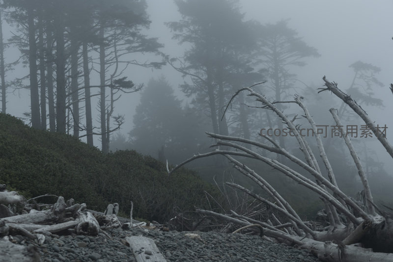 薄雾弥漫在森林边缘,扭曲的枯枝伸向天空,与翠绿的灌木丛形成对比,展现出大自然原始而苍凉的美感。