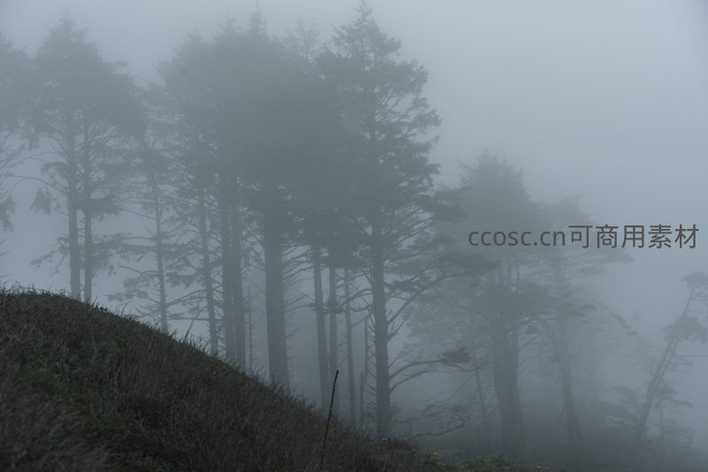 浓雾弥漫的山林间,高耸的树木若隐若现,营造出神秘而宁静的氛围,仿佛置身于童话世界。