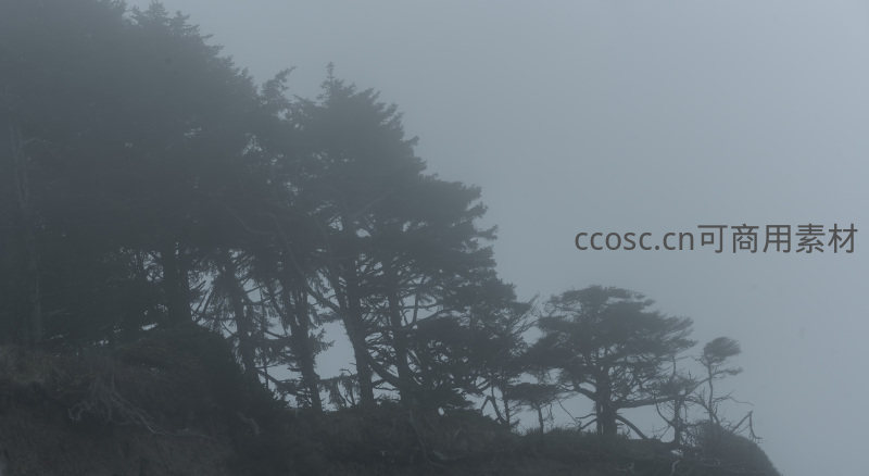 山崖边缘的树木在浓雾中挺立,轮廓模糊却充满力量,展现出大自然的雄浑与诗意般的宁静美感。