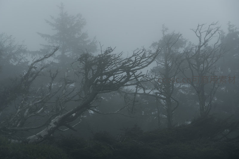被风雕琢的枯木在浓雾中伸展,背景是隐约的针叶林,整体色调灰暗,充满诗意与时间沉淀的沧桑感。