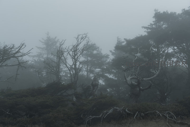 雾气缭绕的悬崖边缘,树木顽强扎根,裸露的根系紧抓土壤,展现自然界的坚韧与生存力量。
