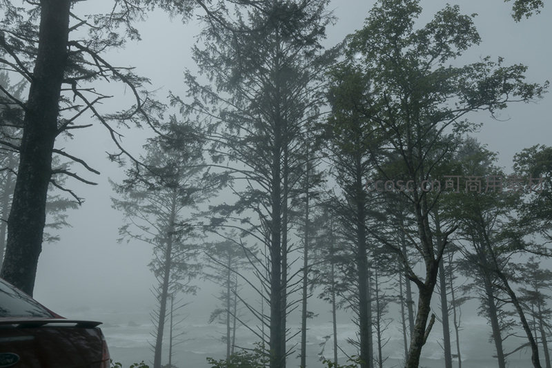 浓雾笼罩的密林深处,一辆汽车静静停驻,人迹罕至的自然景象与现代元素交织,别具探索之趣。