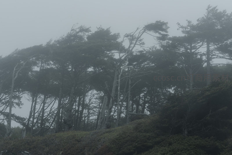 雾中森林,苍劲古树静立山巅