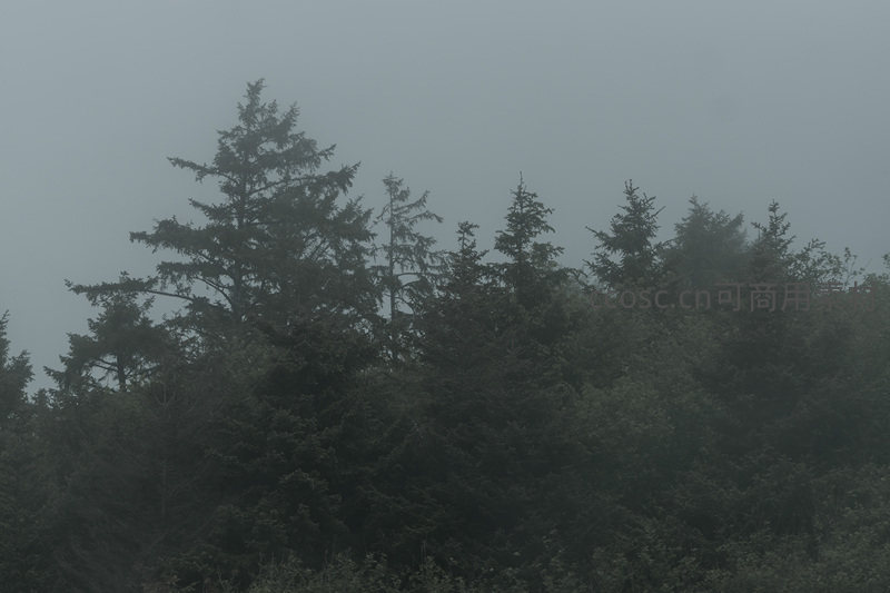 浓雾如纱轻覆山巅,深绿色针叶林树冠在雾中若隐若现,营造出宁静致远、远离尘嚣的森林秘境之感。