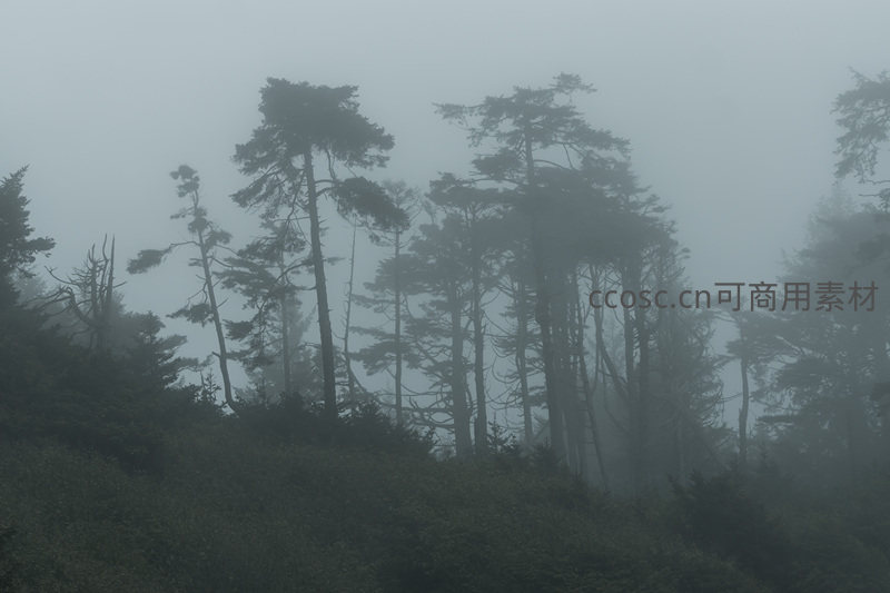 浓雾弥漫山间,高耸的松树若隐若现,营造出神秘而宁静的氛围,仿佛置身于远离尘嚣的世外桃源。