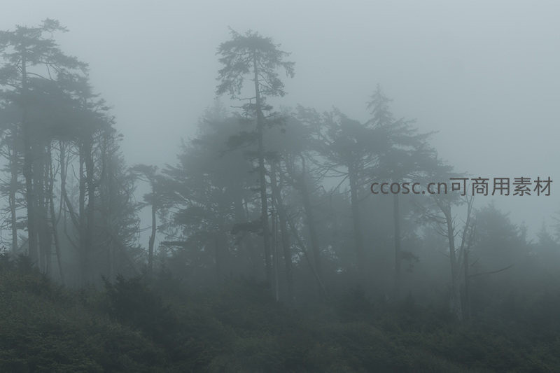 层层薄雾笼罩着茂密的森林,树木在雾中影影绰绰,透露出原始而纯净的气息,令人向往自然之深邃与安宁。