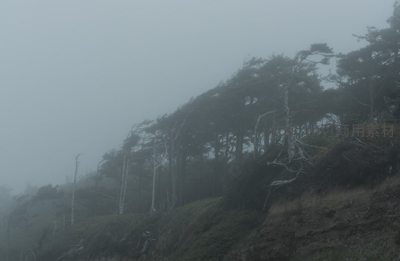 薄雾笼罩山林,松柏枝干在灰白雾气中若隐若现,坡地覆盖低矮灌木,整体画面沉静而富有层次感。