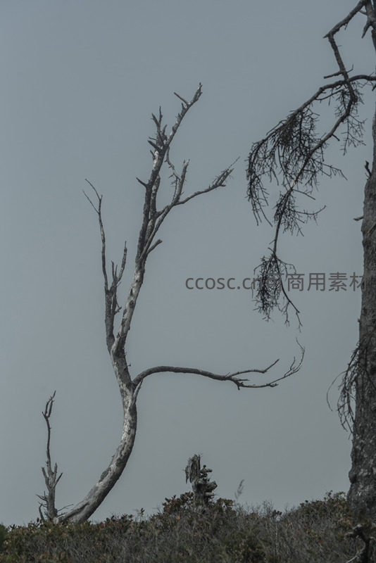 灰蒙天空下,一棵光秃的枯树以优雅的姿态伸向远方,其嶙峋枝干勾勒出一幅充满诗意的自然画卷,静默而有力。