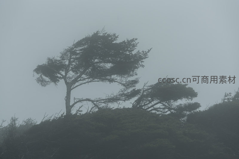 一棵孤树在浓雾笼罩的山顶傲然挺立,枝干随风舒展,展现出生命的顽强与自然的诗意,画面充满力量与美感。